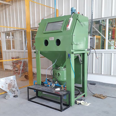 SPB 12090 is a Pressure Blasting machine (High pressure blasting machine using compressed air). THe machine is ideally suitable for high pressure blasting of jobs using Aluminum Oxide Media/ Steel Shots/ Steel Grits etc. The machine can be manufactured with Nozzle Reciprocation System, Motorised Turntable, Motorised Track and Trolley/ Tumbler Basket etc.